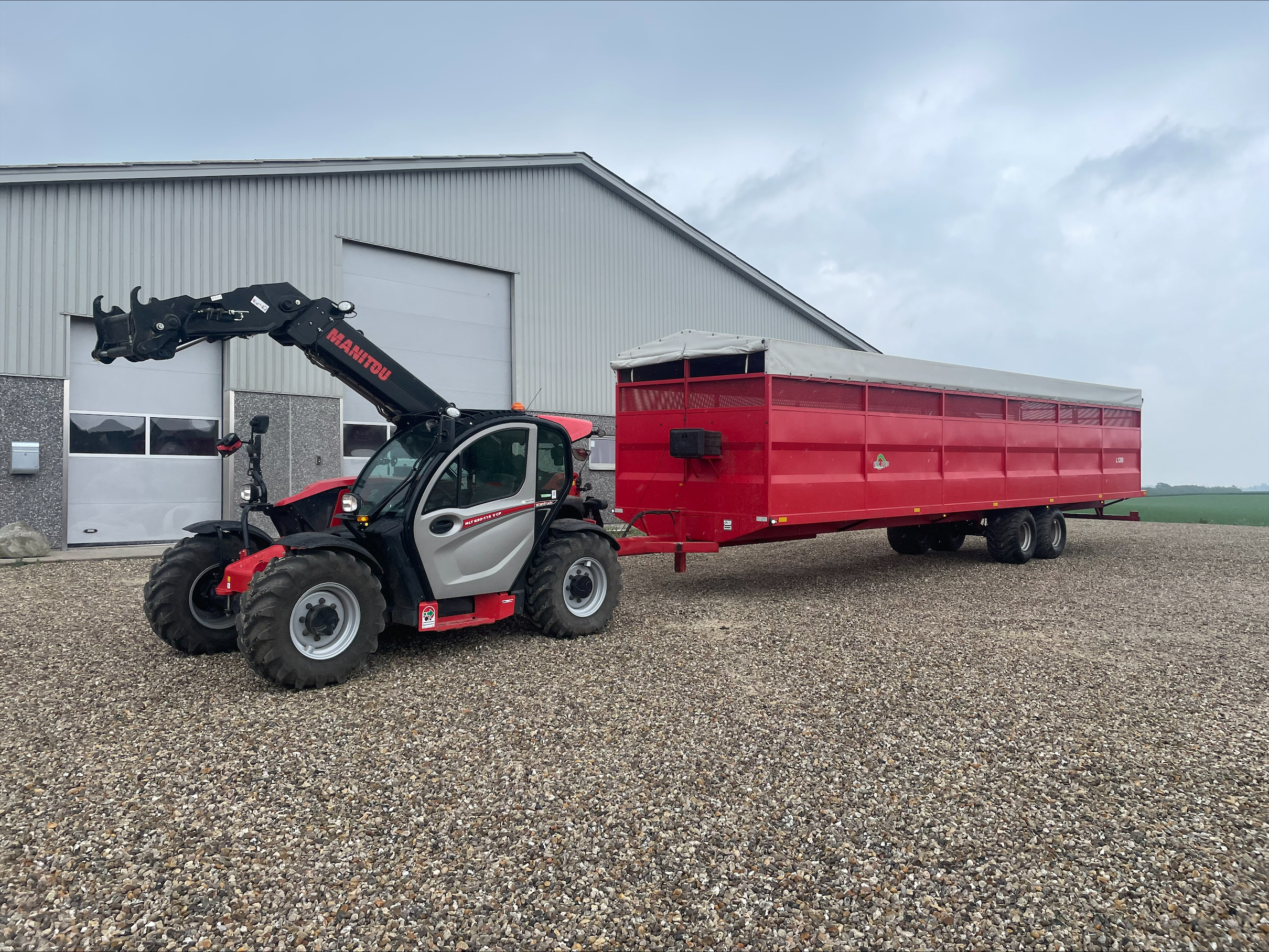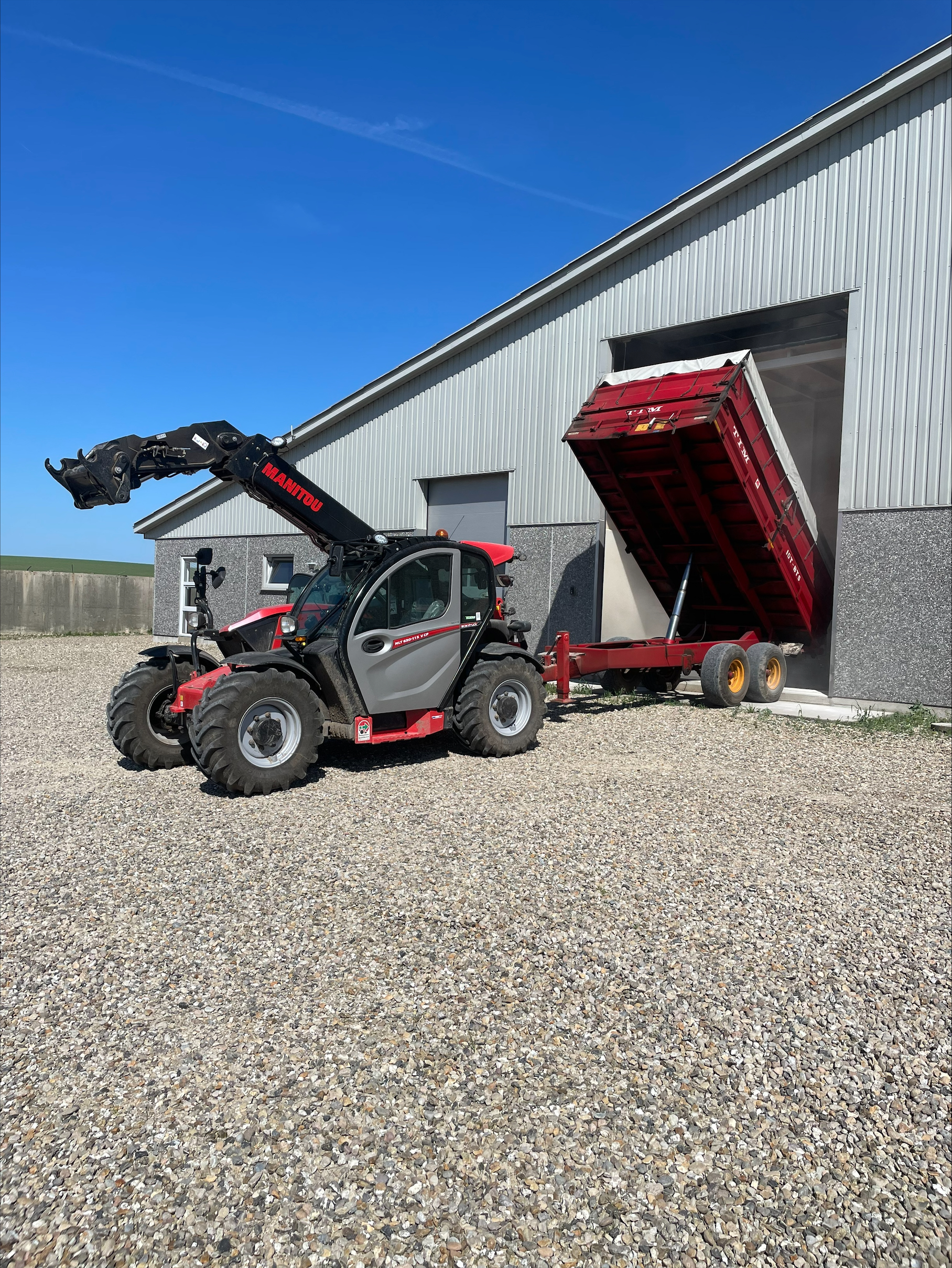 Billedtekst 2: Hos Krogsgaard Opformering bliver Manitou MLT630-115V CP landbrugsteleskoplæsseren brugt til mange ting som for eksempel her, hvor han er i gang med at tippe den vogn, han har spændt bagpå. Det kan lade sig gøre, fordi han har fået ekstraudstyr i form af stik og olieudtag.