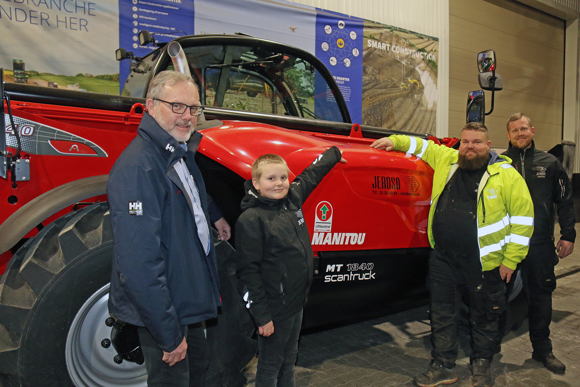 Billedtekst 5: Lunderskov-firmaet Jeroso snuppede en Manitou MT1840 teleskoplæsser med fra ScanMek. Her fra højre firmaets montør Morten Lassen, Kim Roed og hans søn, Kasper Roed, og til venstre Scantrucks distriktschef Freddy Lange Nielsen.