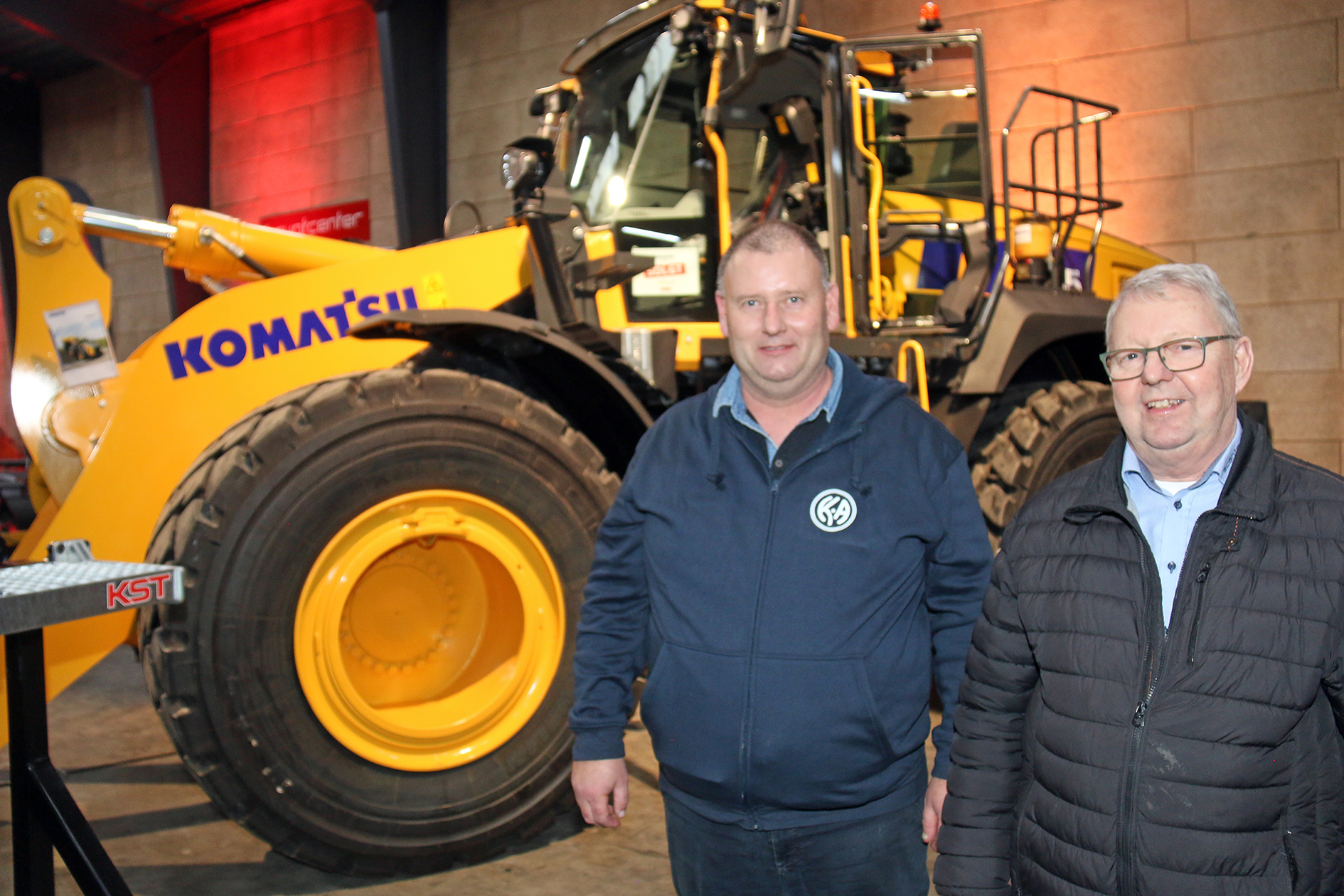 ”Den nye motor giver mulighed for at køre 16.000 timer uden skift af partikelfilter, og den har større effekt og drejningsmoment, så lavere omdrejninger optimerer brændstofeffektiviteten”, kunne key account manager Poul Erik Nielsen blandt andet tale med Ken Christensen om. Ken Christensen er maskinfører hos fynske KA Grus, som har købt det første eksemplar af læssemaskinen. Nu skal Komatsu WA485’eren så leveres i firmaets grusgrav ved Årslev syd for Odense.